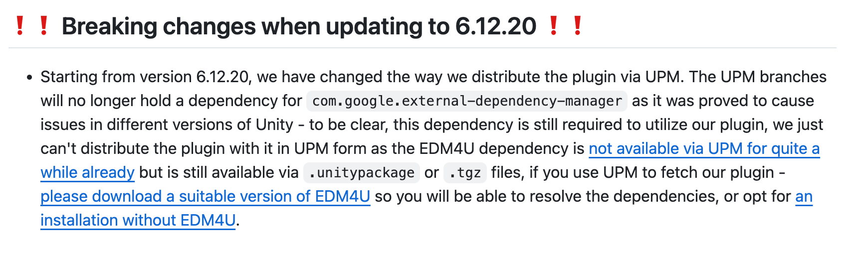 安装 EDM4U(external dependency manager): 从 https://developers.google.com/unity/archive#external_dependency_manager_for_unity 下载 unitypackage 包,然后在 unity editor 的 Assets → Import Package → custom package 导入下载的包。