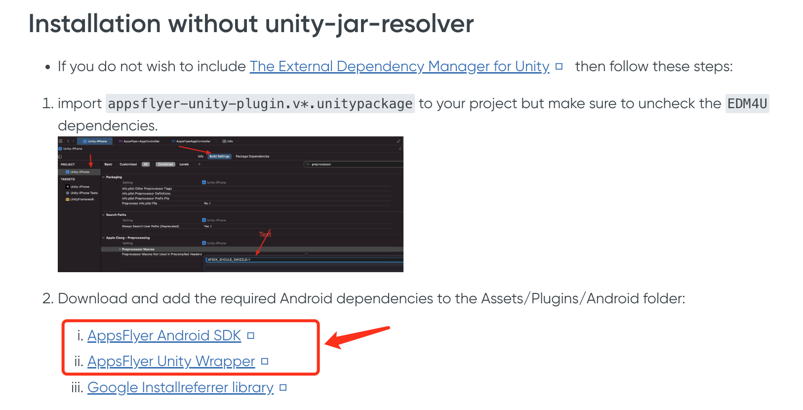 - 解决:尝试了 Assets → Mobile Dependency Resolver → Android Resolver → Force Resolve, 但无效(resolve 失败)。后来参考 appsflyer integrate docs中的下图所示内容,将红框中的两个包下载后放到对应目录,这样就解决了。(是不是可能一开始就使用下图中的安装方式更好?就不用安装 EDM4U 这些了?)